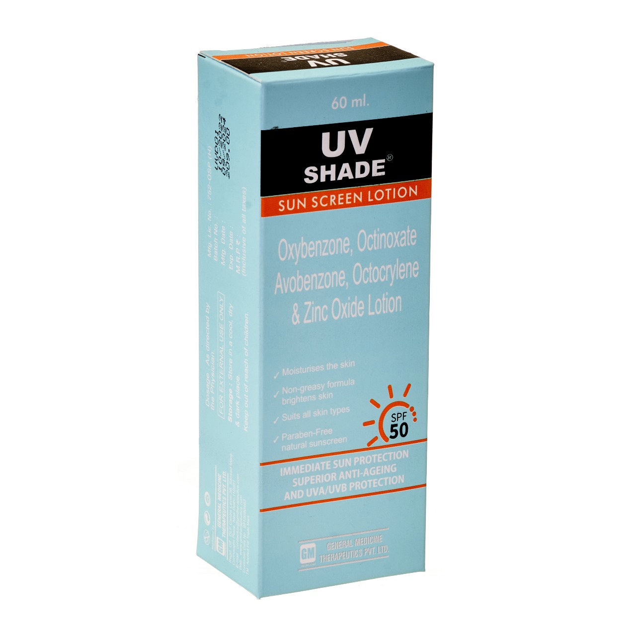 Apply UV shade sunscreen lotion liberally & evenly on the face, neck and exposed area of skin 20 to 30 minutes prior to sun exposure. Further reapplication is only necessary after activities such as swimming or after excessive sweating.KEY INGREDIENTS: